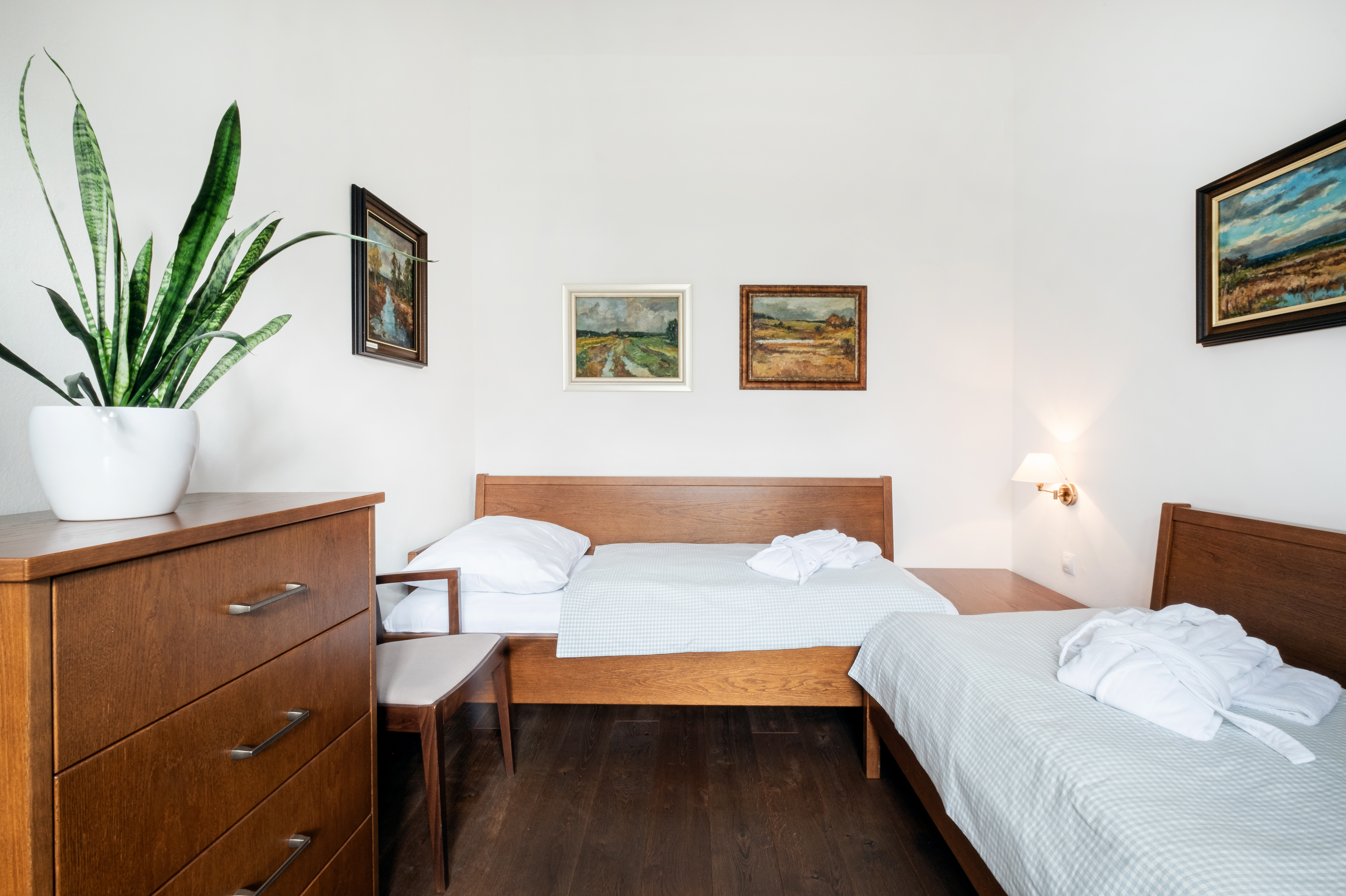 It offers a view of the adjoining garden, town walls and the dam of the Svět pond. It compromises two bedrooms, a sitting room and private bathroom with bathtub, shower unit and toilet. The suite is equipped with a small kitchen with minibar various kinds of drinks and electric kettle.