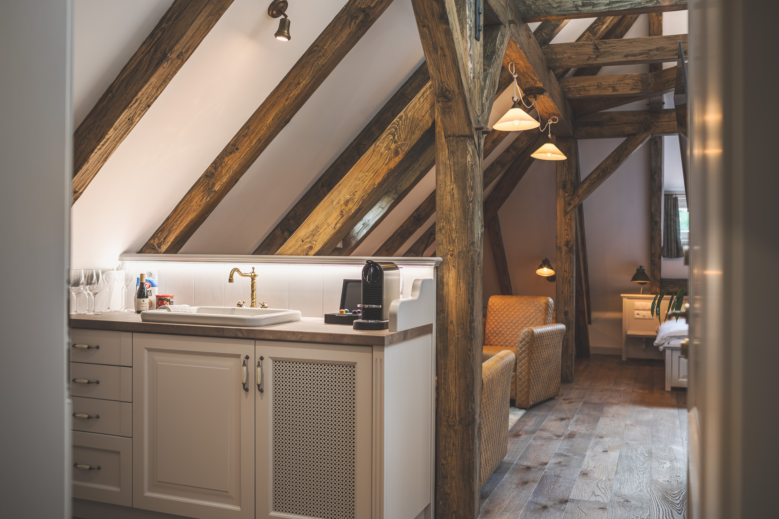 It is located on the first floor of the newly renovated part of the original building. It consists of one large room with a double bed, a fixed double bed and a sofa bed, The suite includes a shower, a free standing bath and a toilet. The apartment is automatically fully air-conditioned to a constant temperature. The room is equipped with a minibar and Nespresso coffee machine.